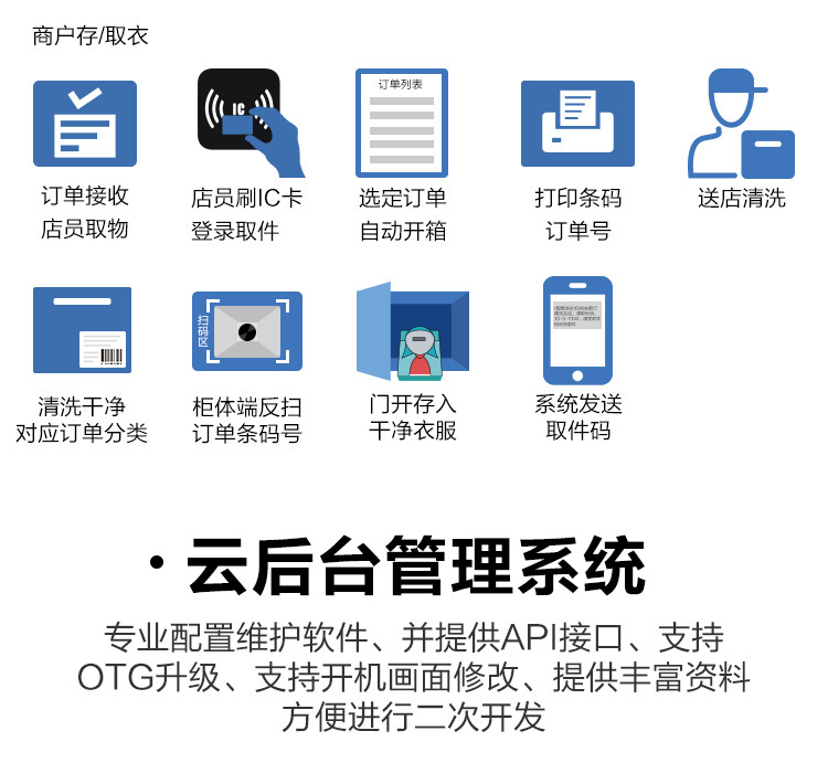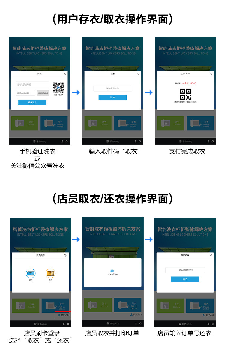 當今大數據,人工智能,物聯網等技術手段的革新,自助經濟服務,給人們帶來方便和全新的購物體驗。把生活與智能化緊密結合,提升生活幸福感。智能洗衣柜是顧客與洗衣店之間的物流智能柜,洗衣店為需要洗衣、洗鞋、干洗等用戶提供全天24小時自助服務。